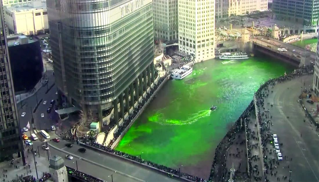 Чуть западнее, в Чикаго, праздник отметили раскрашиванием реки в зеленый цвет. Процесс засняли на камеру и ускорили — выглядит впечатляюще.