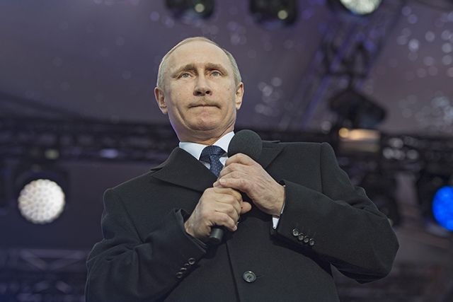 После речи Путина прозвучал гимн, к последним словам которого «Славься страна, мы гордимся тобой» президент громко добавил в адрес публики: «А страна гордится вами». «Пу-тин, Пу-тин, Пу-тин!» — начали в ответ скандировать люди.