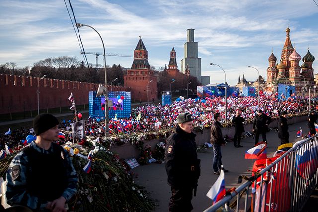 Васильевский спуск не cмог вместить всех пришедших, поэтому они стояли и на всем протяжении Большого Москворецкого моста, где в конце февраля был убит оппозиционный политик Борис Немцов. На парапете моста до сих пор лежат цветы, в день митинга их обнесли оградой, тут же выставили цепь полицейских.
