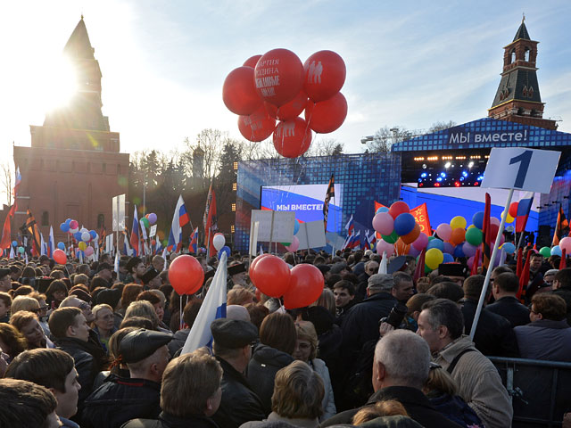 Президент отметил, что "в России всегда считали, что русские и украинцы - это один народ". Путин выразил уверенность, что украинский народ еще даст оценку тем, кто довел Украину до того состояния, в котором страна находится сегодня. "А сами мы пойдем вперед, будем укреплять нашу государственность", - резюмировал Владимир Путин. Президент обещал: "Преодолеем те трудности, которые сами себе создаем, и те, что нам подбрасывают извне". Он спел гимн России вместе с Ларисой Долиной и, прокричав в микрофон "Да здравствует Россия!", покинул место проведения акции. Видеозапись речи Путина приводит телеканал LifeNews.