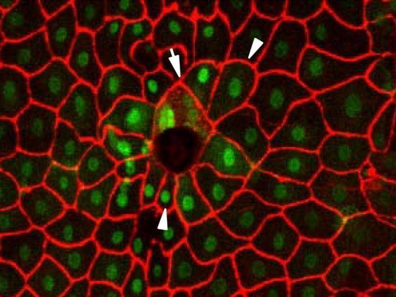 Логично предположить, что, раз повреждение механическое, то и сигнал изначально должен быть механическим, а потом уже трансформироваться в молекулярные сигнальные пути. Оказывается, таким сигналом для клеток является отсутствие рядом других клеток. Когда кожный покров не поврежден, каждую клетку кожи окружают другие клетки, они поддерживают друг друга, возникает механическое напряжение. Если одна из клеток выбывает из строя, ее соседи ощущают отсутствие напряжения с ее стороны.
