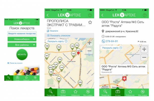 Бесплатное мобильное приложение «Поиск лекарств» представляет собой фармацевтическую карту города Новосибирска, на которой после указания нужных параметров появляются метки.