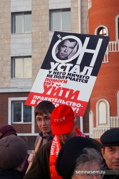 Претензии к Дмитрию Медведеву, занимающему в данный момент пост премьер-министра России, по мнению коммунистов – очевидны. Написано же «…он устал. У него ничего не получается. Помоги ему уйти. Правительство в отставку!».