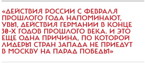 Любые исторические параллели хромают. И все же, даже с поправкой на это, охватившая Россию военно-патриотическая истерия вызывает в памяти пресловутый «веймарский синдром», об опасности которого предупреждал Егор Гайдар еще девять лет назад («Коммерсантъ», 06.02.2006). А действия России с февраля прошлого года напоминают, увы, действия Германии в конце 30-х годов прошлого века. И это еще одна причина, историческая, по которой лидеры ведущих и не ведущих стран Запада, вновь объединенные дисциплиной «Холодной войны», не приедут в Москву на парад Победы.