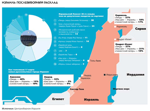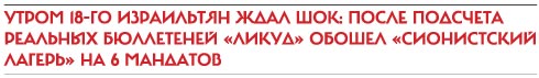 «Русские» предпочтения Несмотря на успех «Ликуда», в целом правый лагерь в Кнессете увеличился всего на несколько мандатов. Примечателен и полный провал на выборах крайне правого «Еврейского дома» во главе с Нафтали Бенеттом — у этой партии осталось только 8 мест (было 12). Но «Ликуду» и такого успеха достаточно, в конце концов операция «Гевалт» была рассчитана только на своих.
