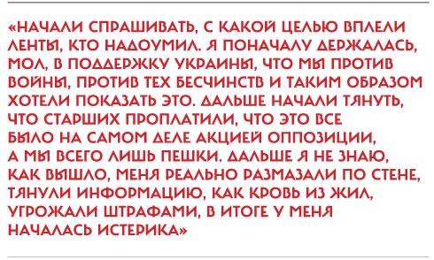 19 марта, четверг ФСБ побеседовала со школьницей из-за ленточек цветов украинского флага. 14-летняя школьница из Саратова была задержана 18 марта вместе с еще несколькими молодыми людьми после акции в честь годовщины присоединения Крыма за то, что вплела в волосы ленты цветов украинского флага. Полицейские переписали личные данные подростка и отпустили домой. На следующий день девушку вместе с родителями вызвали в школу. В присутствии учителей сотрудники правоохранительных органов, один из которых представился сотрудником ФСБ, провели беседу с подростком. «Меня реально размазали по стене, тянули информацию, как кровь из жил, угрожали штрафами, в итоге у меня началась истерика», — позже поделилась школьница с журналистами.