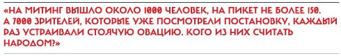 Перед зданием театра дважды проходили митинги. Вам не кажется, что вы набрались западных идей, решили устроить этакую Европу в Новосибирске, а тут к вам приходит народ и говорит: «Нам эти ценности чужды, не хотим такого театра». Вы себя чужим здесь не чувствуете? Нет, я здесь не чужой. На митинг вышло около 1000 человек, на пикет не более 150. Они спектакля не видели и не увидят, потому что им это неинтересно, как они говорят. А 7000 зрителей, которые уже посмотрели постановку, каждый раз устраивали стоячую овацию. Кого из них считать народом?