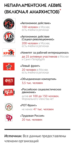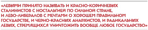 В итоге часть левых объявила Майдан фашистским переворотом. Другая увидела в нем борьбу с коррумпированным олигархическим режимом. Споры оказались настолько ожесточенными, что после украинских событий совместные действия со многими организациями стали невозможны, констатирует член «Автономного действия (Социально-революционного)» — не путать с уже упомянутым анархистским «Автономным действием» (см. справку*) — Святослав Гертнер. Впрочем, мировоззренческий антагонизм в левой среде его не удивляет — цельного левого движения, поясняет собеседник журнала, в России не было никогда: «Левыми принято называть и красно-коричневых сталинистов с ностальгией по сильной стране, и лево-либералов с мечтами о хорошем правильном государстве, которое защищало бы гражданские права меньшинств, и черно-красных анархистов, и радикальных левых, стремящихся уничтожить вообще любое государство и передать всю политическую и экономическую власть непосредственно в руки народа, и безумных пенсионеров с иконами Сталина, и радикальных феминисток».