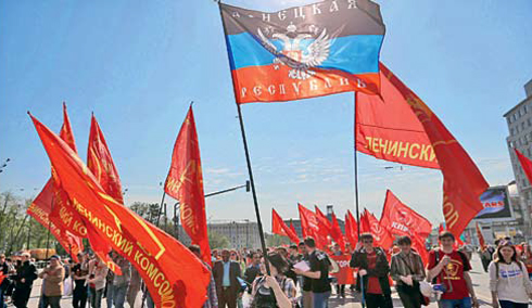 На первомайской демонстрации члены Ленинского комсомола маршировали вместе со сторонниками «Донецкой народной республики», Москва, 1 мая 2014 года Любимая тема