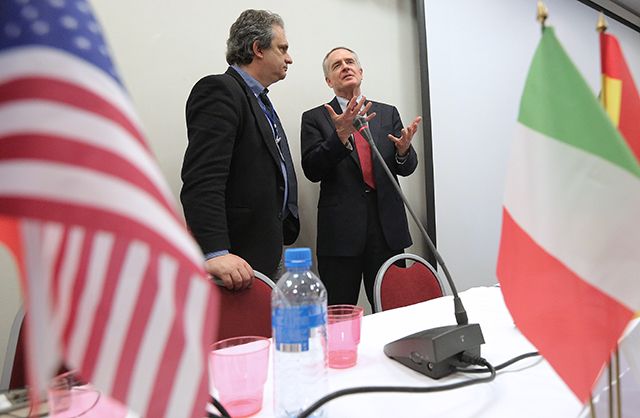 В перерыве итальянец объяснил, зачем он и другие европейцы приехали в Петербург и почему поддерживают Россию: «Мы хотим, чтобы не было войны, чтобы вернулась нормальная торговля с Россией, а также нам нужна альтернатива американскому империализму». «Вот зачем нам сотня американских баз в Италии?» — обратился Фьоре к журналисту The New York Times. Американец в ответ поинтересовался, не смущает ли итальянца, что Путин просто использует крайне правые партии для своих целей. «Нет! Тот же [премьер Италии] Маттео Ренци в марте приезжал в Москву, пытаясь наладить отношения с Путиным. Даже [канцлер Германии] Ангела Меркель и [президент Франции] Франсуа Олланд не хотят ссориться с Россией. Мы просто говорим открыто то, что они говорят скрытно. В Европе никто, кроме, может быть, стран Балтии, не хочет санкций против России, все хотят дружить с Россией», — ответил итальянец. По его словам, США настаивает на санкциях, хотя их товарооборот с Россией в прошлом году вырос на 20%, а у Европы на те же 20% упал.