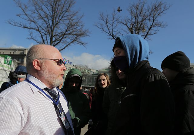 Выбежал пообщаться с антифашистами и лидер Национально-демократической партии, один из самых известных русских националистов Константин Крылов.