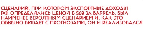 № 1 за 2015 год) никаких сценариев выхода из кризиса в принципе не просматривалось. При цене нефти выше $70 за баррель — сценарии «быстрого отскока», можно было на горизонте двух-трех лет готовиться к некоторому ускорению и так идущих политико-экономических процессов, но в целом картина принципиально не отличалась от того, что происходило в стране после 2009 года. Сценария, при котором экспортные доходы РФ определялись ценой в $60 за баррель, мы в январском анализе не давали — наименее вероятный сценарий, как это обычно бывает с прогнозами, и реализовался.