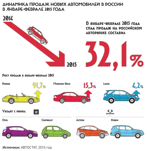 С одной стороны, General Motors, один из крупнейших игроков на российском рынке автопрома, объявил о том, что во второй половине года резко сократит присутствие в России и заморозит большую часть сборочных мощностей в стране. Немедленно появились рассуждения о том, что GM — компания американская, случай исключительный, и ее примеру, по словам министра промышленности России Дениса Мантурова, никто не последует. Однако тут же и южнокорейская SsangYong заявила, что тоже сокращает свое присутствие на рынке России. Их конкуренты — как иностранные, так и российские производители автомобилей — с облегчением выдохнули: в офисах флагманов российского автопрома делают сейчас ровно то же самое, что General Motors и SsangYong, но не разом, а медленно и без громких объявлений (см. инфографику). А как прикажете реагировать на снижение в феврале производства автомобилей на 17 % при снижении продаж на треть!