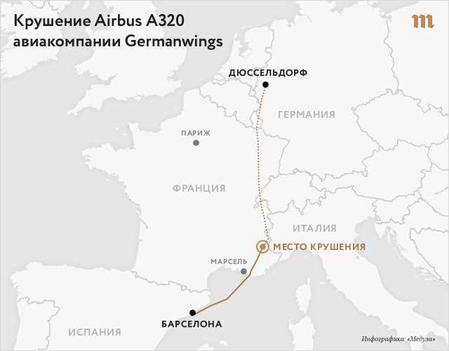 Утром 24 марта потерпел крушение самолет А320 авиакомпании Germanwings. Лайнер выполнял перелет по маршруту Барселона — Дюссельдорф в условиях хорошей видимости, но во французских Альпах неожиданно начал снижаться и через несколько минут упал в горах. Спасатели смогли добраться до места катастрофы лишь через полдня — для этого им пришлось использовать вертолеты. По предварительным данным, никто из пассажиров и членов экипажа не выжил. «Медуза» собирает в одном месте все, что известно и что неизвестно об авиакатастрофе.