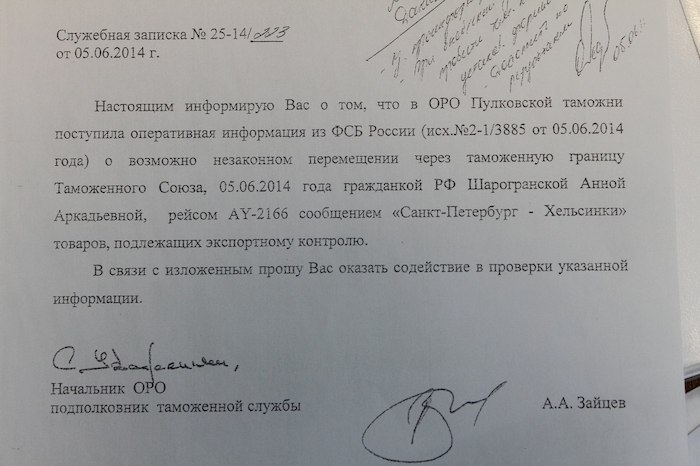 Служебная записка ФСБ Позже проверка показала, что товаров двойного назначения среди вещей Шароградской нет. Тогда сотрудники таможни решили проверить все изъятые носители на предмет информации экстремистского характера. Как сказано в материалах дела, искали по ключевым словам: «методы терактов», «подготовка терактов», «государственный переворот», «методы национальной пропаганды», «kavkazcenter», «terrorist financing», «to destabilize the Putin government». В итоге сотрудники таможни вместе с экспертом ФСБ нашли на флеш-картах почти сотню текстов, которые содержали ключевые словосочетания. Шароградская собирала эти материалы для использования на семинарах по журналистской этике. Университет города Блумингтон (штат Индиана) больше 20 лет ежегодно приглашает руководителя Института региональной прессы, для того чтобы она прочитала курс лекций. По словам Шароградской, все материалы на съемных носителях копировались из открытых источников и никакого экстремизма в них быть не могло. Все попытки защиты Шароградской признать действия сотрудников таможни незаконными успехом не увенчались. Более того, в своем возражении на иск представители МВД сообщили, что в отношении заявительницы должны возбудить уголовное дело по статьям «Публичные призывы к осуществлению экстремистской деятельности» и «Возбуждение ненависти либо вражды, а равно унижение человеческого достоинства». Адвокат Иван Павлов считает, что в первую очередь речь идет о нарушении конституционных прав Анны Шароградской. Собранные материалы сотрудники таможни передали в линейный отдел полиции аэропорта Пулково. После этого, по выражению адвоката Павлова, начался «ведомственный пинг-понг». На протяжении нескольких месяцев правоохранительные органы не могли договориться, кто будет принимать решение по материалам проверки. Полиция передала их в прокуратуру; прокуратура пыталась передать в Следственный комитет; Следственный комитет оспорил решение прокуратуры; а вышестоящая прокуратура отменила это решение, направила обратно в линейный отдел полиции, где принимать этот бумеранг никто не хотел. В итоге материалы попали в Северо-Западное следственное управление на транспорте СКР, в котором уже окончательно отказались от претензий к Шароградской. Следователь не нашел состава преступления в материалах проверки. Следствие вернуло все изъятые вещи. Единственный вопрос — состояние планшета. Его, по всей видимости, пытались взломать. Однако адвокаты эту информацию пока не комментируют.