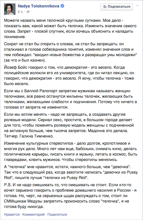 После произошедшего 24 марта скандала между феминисткой Беллой Рапопорт, опубликовавшей колонку о сексизме, и изданием «Медуза», назвавшим ее «телочкой», известная своими феминистическими убеждениями Надежда Толоконникова опубликовала на Facebook пост о необходимости создания «других ролевых моделей» в мужском сознании. Меньше чем за один час запись собрала свыше 590 лайков. Толоконникова предложила называть ее «телочкой круглыми сутками». Девушка добавила, что считает бессмысленным запрет на использование самого слова, но пересмотр его значения находит уместным. По словам Толоконниковой, для изменения «культурного стереотипа» девушкам предстоит «снимать кино, делать политические карьеры, писать книги и музыку, летать в космос, быть главредами, клеить мужиков».
