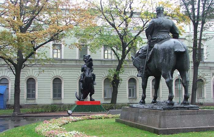 Скульптура «Китайская девочка верхом на динозавре», установленная у Мраморного дворца Конечно, у нас были свои мастера борьбы с высоким. Сергей Бугаев заклеил бинтом классическую античную репродукцию, забинтовал, в этом есть большой смысл. Он делал довольно интересные манипуляции с флагами, не оскорбляя символику и генеалогию. Просто добавил в коктейль элемент алогизмов. Еще 20–30 лет назад многих ужасно клинило, особенно на академической живописи. Я помню поколение, которое все воспринимало серьезно. Когда проходила одна из первых выставок Евгения Михнова-Войтенко (тогда их никто не знал, сейчас покупают за большие деньги), за 3 рубля можно было купить два метра такого андеграунда. Либеральные тетушки сделали выставку его абстракций во Дворце культуры — ну ничего страшного. Но вдруг порядочный живописец, не какой-нибудь конъюнктурщик, народный художник, всю жизнь писавший пейзажи, говорит: «Неужели вы не видите здесь?». Все обалдели, я говорю: «Что?». Он: «Это ведь портрет Троцкого!». Так вот, нет предела шока. И это тебе не прибивать свои причиндалы на Красной площади. Этот внутренний шок растет из души. Такие задумчивые честные художники были зомбированы; работу, которую сейчас считают классической, воспринимали очень остро. Религия и политика в искусстве