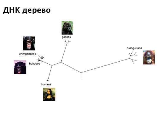 © Политехнический музей Вот череп человека, вот череп неандертальца. Примерно полмиллиона лет назад наши пути разошлись. А вот — шимпанзе. И с шимпанзе мы разошлись около восьми миллионов лет назад. А это — макаки, с которыми мы разошлись тридцать миллионов лет назад. Вы можете спросить: почему древо истории выглядит именно так? Отчего у нас есть родство с неандертальцами? И как можно доказать наше родство с шимпанзе? Отвечать можно начать так: посмотрите на черепа. В принципе, они похожи, да? Особенно с неандертальцами. Но это не очень хороший аргумент, потому что дельфины, например, и рыбы тоже похожи, но большого родства между ними нет. Дельфины — это млекопитающие, и ближайший их родственник — корова. Как мы можем утверждать, что человек действительно имеет более близкое родство с неандертальцами, чем с шимпанзе или макаками? Конечно, это выясняется не на основании похожести костей, а на основании ДНК. Дезоксирибонуклеиновая кислота — та самая, которую в 1953 году расшифровали Уотсон и Крик. Двойная спираль, содержащая генетическую информацию каждого из нас. У каждого человека своя собственная ДНК, и она очень-очень похожа на ДНК других людей. Но примерно один из тысячи нуклеотидов у каждого свой, неповторимый. ДНК — это биологическая молекула, и когда она воспроизводится, то есть когда сплетается, случаются ошибки. То есть, когда производился на свет я, генетическая информация от моих мамы и папы совместилась, но от них мне досталась ДНК, которая была не совсем точной копией, там были кое-какие исправления маленькие. Когда говорят, что можно установить отцовство по ДНК, имеют в виду, что если у ребенка одна из хромосом — папина, то они и вправду родственники. И с тем же успехом можно равнять ДНК человека с ДНК другого вида. Например, мою ДНК с ДНК обезьяны. Или с ДНК мыши. В принципе, можно и просто посмотреть на меня, потом на обезьяну и сказать: «Ну, он, конечно, немного на нее похож, но все-таки не совсем». Однако если мы сравним наши ДНК, то окажется, что они на 98% одинаковые.