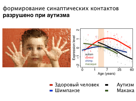 © Политехнический музей Но что интересно. Если мы посмотрим на зеленую кривую макаки, то видим, что, в принципе, у обезьяны формирование нейронных контактов заканчивается уже через несколько первых месяцев жизни. В год это уже взрослая, умная обезьяна. Окно пластичности, то есть период, в течение которого макаку можно чему-то еще обучить, значительно меньше, чем у человека, — всего несколько месяцев, после чего оно плотно захлопывается навсегда. У нас это окно открыто гораздо дольше и, в принципе, полностью никогда не закрывается. Потому-то мы и в 80 лет еще способны выучить иностранный язык, и впервые сесть на велосипед в 70. Это очень интересно, потому что это доказывает, что не только синапсы, но и более глубинные молекулярные образования ведут себя по-другому в человеческом мозгу. Конечно, вы можете спросить: как вообще этот процесс связан с нашими мозговыми функциями? Может, дело все-таки в размере? У нас больше мозг, нам нужно больше синаптических контактов, на это уходит больше времени? Конечно, если бы мы имели дело с мышами, мы бы могли произвести некоторые мутации и посмотреть, станет ли человек глупым. Или, наоборот, станут ли мыши умными, как люди. В первом случае это невозможно, во втором сложно. Короче, наука не сумасшедшая, чтобы этим заниматься. Но что можно все-таки сделать, так это посмотреть на болезни. Например, аутизм: хороший пример для ученых и очень плохой — для родителей. Аутизм — это когда вместе с развитием мозга нарушаются все наши человеческие функции: возможность общаться, способность принимать нестандартные решения, менять рутину.