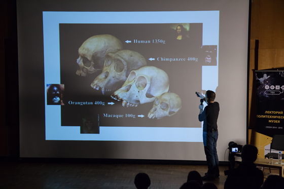 Два миллиона лет назад на планете существовало бесчисленное множество видов. Мы обо всех них знаем лишь по найденным черепам (ДНК двухмиллионолетней выдержки мы пока не умеем восстанавливать). Homo Sapiens, наш предшественник, который жил около полумиллиона лет назад. Знаменитый Homo Erectus, заселивший всю планету. Мы смотрим на них и видим, что никого похожего на нас здесь нет. Какие-то там обезьяны бегают по лесу. Но не надо заблуждаться. Как показывает наука, наши предшественники постоянно друг с другом скрещивались, у них были дети, и эти дети, в общем-то, мы и есть. То есть в каждом из нас есть какое-то количество ДНК неандертальца. И смысл лишь в том, что все эти ребята вымерли, а мы остались. Мы — победивший вид. И так как мы всех истребили и больше истреблять как бы некого, мы принялись друг за друга. Но это уже политика, поэтому вернемся к размерам мозга.