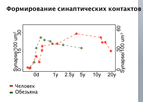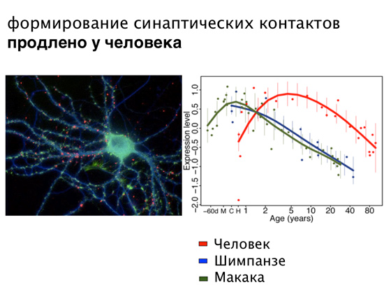 © Политехнический музей Перед вами результаты исследования, которое наша лаборатория провела совместно с одной американской компанией. Это совсем новые результаты — они еще даже не опубликованы. На графике абсолютно точно видно, что у детей с аутизмом формирование синаптических контактов нарушено. Оно, конечно, не такое, как у макак или шимпанзе, но оно возвращается к архаичной структуре. У аутистов разрушена программа формирования, когнитивная функция. И это подтверждает, что длительное формирование синаптических контактов — даже в зрелом возрасте — является, конечно, не единственным, но важным механизмом, который помогает нашему сознанию и нашим когнитивным способностям сформироваться. Что это значит практически? Звоночек для родителей. От года до пяти лет — это время, когда у вашего ребенка формируются нейронные сети. И если это время, как в моем случае, проведено с бабушкой и дедушкой, то мозг будет сформирован именно под их воздействием. Я это в себе постоянно замечаю — я реагирую на какие-то события так, как реагировали бы на них мои бабушка и дедушка, а не как мои родители. И если вы хотите воспитать ребенка каким-то определенным образом, то занимайтесь им в первые пять-десять лет жизни. После, конечно, тоже много всего будет происходить, и пластичность какая-то даже остается, но привить какие-то привычки, умения, старания будет куда сложнее. То есть все дело не в размере мозга и не в количестве синапсов, а в развитии. Понятно, что это частичный ответ на вопрос, поставленный в названии лекции, но — не нужно думать, что все загадки уже раскрыты.