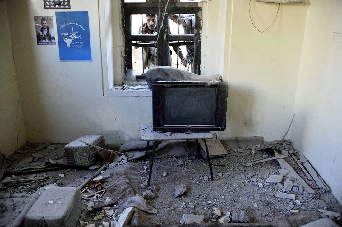 Хуситы осматривают место авиаудара ВВС Саудовской Аравии в Сане, 26 марта 2015 года