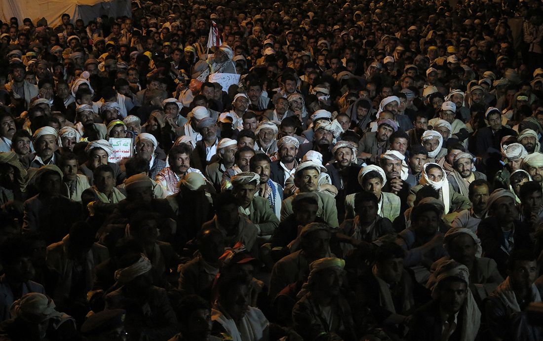 Сторонники хуситов слушают телеобращение Абдула Малика аль-Хути, сентябрь 2014 года
