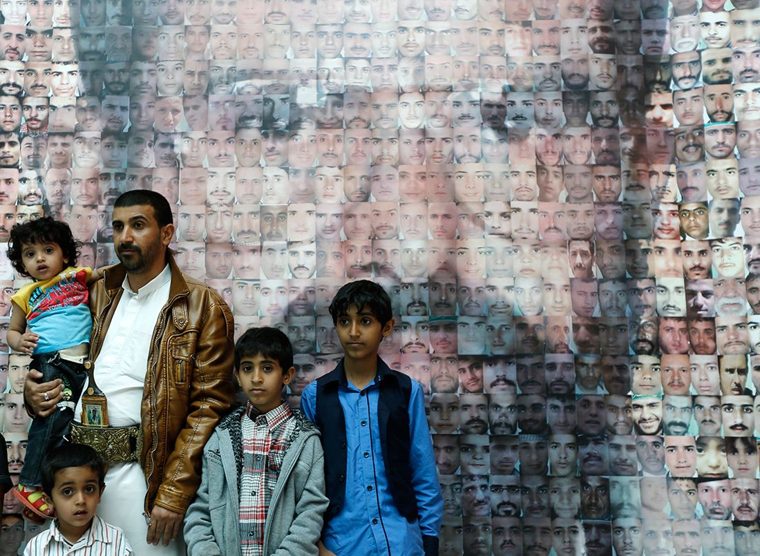 Семья фотографируется на фоне изображений погибших в боях хуситов, март 2015 года