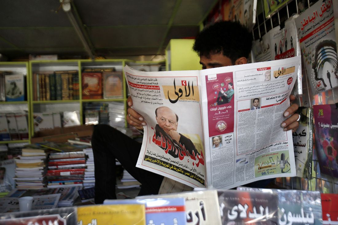 Сана, февраль 2015 года. На первой полосе газеты изображен президент Йемена Хади, только что подписавший прошение об отставке (затем он его отозвал)