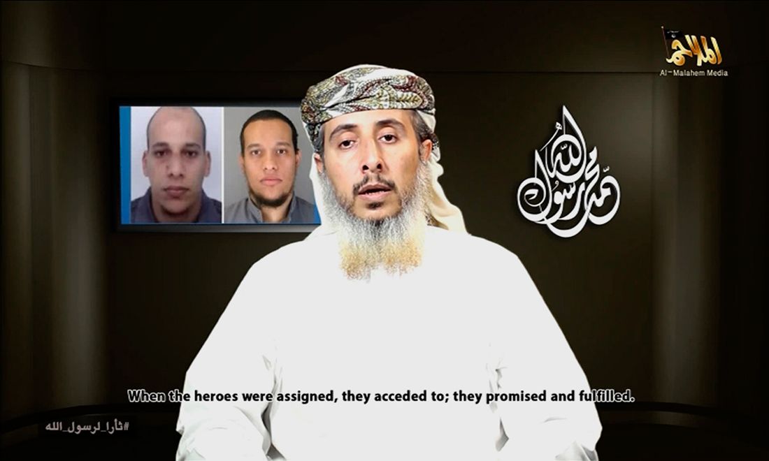 Выступление лидера «Аль-Каеды на Аравийском полуострове» Нассера бин Али аль-Анси (на заднем плане — братья Куаши)
