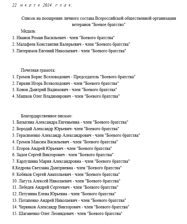 Список членов Союза ветеранов Афганистана примечателен лишь тем, что там фигурируют в том числе лица 1991 года рождения, так что если они и могли воевать в Афганистане, то разве что за США (или, наоборот, за талибов). Но награждали их не за Афганистан, что становится особенно ясно при изучении списка «Боевого братства», который как раз-таки очень примечателен: