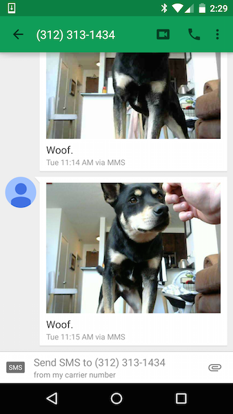 Когда собака нажимает на кнопку, запускается скрипт, который делает фотографию, загружает ее на Dropbox и отправляет MMS. Последний шаг происходит с помощью платформы Twilio, в которой работает Грег Бог (рассказ о собачьем селфи с подробным описанием схемы и исходным кодом опубликован в блоге компании).