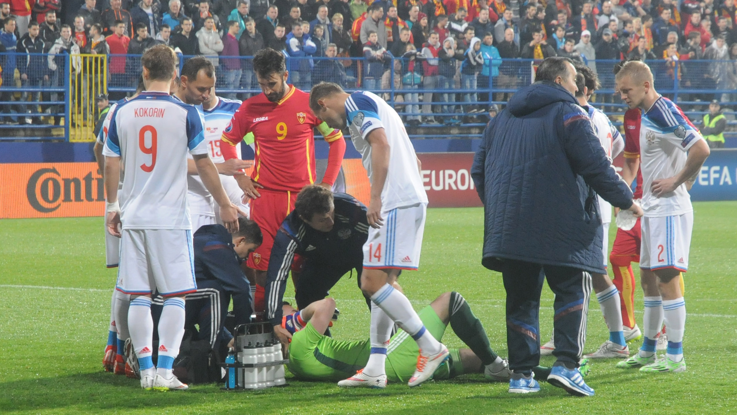 Суть истории такова. На первой же минуте игры из фанатского сектора на поле был брошен зажженный файер, попавший в российского вратаря Игоря Акинфеева. Этот момент четко зафиксировала телетрансляция. Игру прервали примерно на полчаса, Акинфеева вынесли с поля на носилках, затем он был доставлен в больницу, где ему были диагностированы ожог в области шеи и сотрясение мозга. Факт, безусловно, возмутительный, и следует ждать от европейских футбольных властей серьезного наказания для Черногории, – например, присуждения сборной этой страны технического поражения, как это предусмотрено регламентом УЕФА.