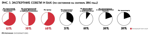 Организация бизнеса Важной частью диссертационного бизнеса является сотрудничество различных «фирм». Часто члены диссертационного совета, который можно считать относительно чистым, служат оппонентами в какой-нибудь «лавочке» Недавно автор исследовал диссеродельный куст Московского государственного строительного университета, в котором нашелся такой персонаж — Анастасия Сафронова. В своем диссертационном совете она ничем не отличилась, зато постоянно оказывалась оппонентом у аспирантов профссора Анатолия Егорова в Государственной академии специалистов инвестиционной сфере (ГАСИС). Все три работы, которым она оппонировала (по мнению автора — NT ), отличались от исходника лишь титульным листом. Венчает структуру диссертационного бизнеса Высшая Аттестационная Комиссия. Именно там сидят настоящие «крестные отцы» этого промысла. В ВАК диссертации рассматриваются экспертными советами. Например, наши исследования показывают, что экспертные советы ВАК по экономике и праву держат 50-65 % «голосующих акций» этого бизнеса. Практически каждая уважающая себя фабрика фальшивых диссертаций направляет своего представителя в экспертный совет. Так, упоминавшийся совет 212.198.01 по экономике при РГГУ имел аж двух представителей в экспертном совете ВАКа. Из приведенных выше диаграмм видно, какие области науки прежде всего востребованы мошенниками: там нет фундаментальных естественно-научных дисциплин, но зато гуманитарные направления, особенно в сфере экономики и юриспруденции, представлены во всем своем многообразии — степени именно по экономике и праву особенно востребованы российской бюрократией — от депутатов до руководителей (см. рис. 3).