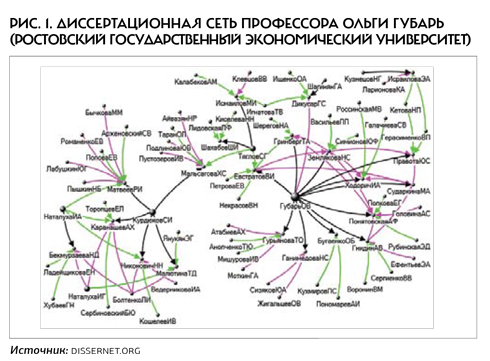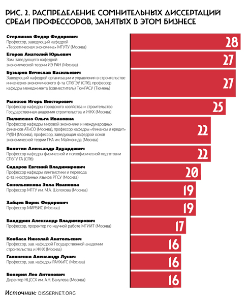 увеличить Ударники антинаучного труда Два года работы «Диссернета» дали нам уникальное понимание, как растут «плевелы от науки» и как некогда нормальные ученые, диссертационные советы и целые университеты перерождаются в сорную траву. Сеть «диссертационных фабрик», опутавшая страну, имеет ярко выраженную структуру полицентрических кустов. Вот, например, один кусочек такой сети (см. рис. 1): разными цветами на нем выделены роли, в которых тот или иной профессор поучаствовал в очередной фальшивой защите: черным — как руководитель, сиреневым — как донор текста, зеленым — как оппонент. У экспертов «Диссернета» много таких картинок: они дают нам обширную почву для выводов о структуре диссертационной индустрии в России. Во-первых, плагиат — это не проделки нерадивых соискателей, а поставленный на поток бизнес их руководителей. Можно поверить в то, что два-три абзаца без должных кавычек в работе соискателя и проскочат мимо глаза шефа. Но поверить, что работа, отличающаяся от источника лишь переклеенной титульной страницей, прошла незамеченной от научного руководителя? Не смешите. Чем же, спрашивается, занимался аспирант все три года? И где были глаза руководителя, когда тому поднесли непонятно откуда взявшийся «кирпич»? Лидером в личном зачете, по мнению «Диссернета», стал заведующий кафедрой «Теоретическая экономика» Московского государственного университета технологий и управления (МГУТУ) Федор Стерликов, которого эксперты подозревают в 28 клиентских диссертацих (см. рис. 2). С отрывом всего в одну диссертацию за ним следуют зам. заведующего кафедрой экономической теории столичного Института экономики (ИЭ) РАН Анатолий Егоров и заведующий кафедрой организации и управления в строительстве инженерно-экономического факультета Санкт-Петербургского государственного экономического университета (СПбГЭУ) Вячеслав Бузырев.