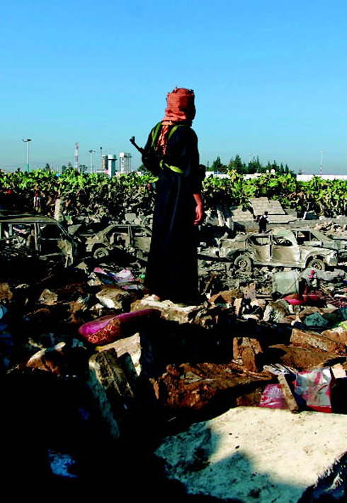 Этот снимок сделан 26 марта 2015 года неподалеку от Саны, Йемен, после массированного авиабомбового удара со стороны ВВС Саудовской Аравии. В результате бомбардировки погибли 13 мирных граждан, не имевших никакого отношения ни к мятежникам-хуситам, ни к покинувшему страну президенту Хади.