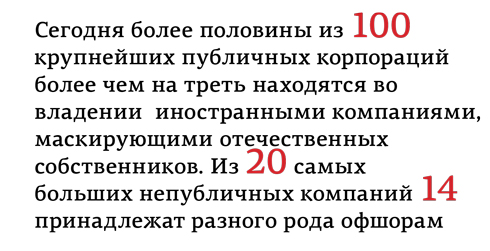Этих фирм масса. Сегодня в стране более половины из 100 крупнейших публичных корпораций более чем на треть находятся во владении иностранными компаниями, маскирующими отечественных собственников. Из 20 самых больших непубличных компаний 14 принадлежат разного рода офшорам? В списке и КЭС-Холдинг, и «Сибур», и «Металлоинвест», и УГМК, и СУЭК, и Трансмашхолдинг, и многие другие. Цель — минимизация прибыли и, соответственно, налогов. Механизм хорошо известен: компания-собственник, зарегистрированная, к примеру, на Кипре или в Люксембурге, создает фиктивные обязательства и таким образом выводит из России значительную часть доходов корпорации, существенно занижая реальную прибыль. Через цепочку фирм, владеющих друг другом, деньги уходят, как правило, в юрисдикции с нулевой ставкой налога на прибыль — такие как BVI (Британские Виргинские острова) или остров Мэн — откуда возвращаются реальному бенефициару в виде дивидендов, облагаемых по обычной ставке подоходного налога в 13 % (а до начала 2015 года — 9 %). Если и это отдавать государству не хочется, можно просто оформить на офшор ту или иную собственность (как за рубежом, так и в России) и вообще ничего не платить. Ущерб от такой «налоговой оптимизации» оценивался в 2013-2014 годах в $20–30 млрд в год, что с учетом девальвации составит в этом году 14–17 % доходной части федерального бюджета.