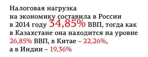 Россия как офшор Способ следующий: превратить российскую экономику если не в большой офшор, то в самую либеральную с налоговой точки зрения и крупную экономику мира. По расчетам Валерия Горегляда, главного аудитора Банка России, общая сумма собираемых в России в бюджеты всех уровней налогов (профессионалы называют этот показатель «налоговой нагрузкой на экономику) составила в России в 2014 году 34,85 % ВВП, тогда как в Казахстане она находится на уровне 26,85 % ВВП, в Китае — 22,26 % ВВП, а в Индии — 19,36 %.