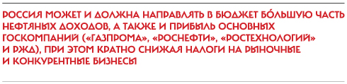 Однако, в петрогосударствах, то есть в тех странах, где бюджет наполняется в основном средствами от экспорта сырья (а Россия — она из таковых), эта нагрузка намного ниже — по расчетам Index of Economic Freedom за 2014 год, в Саудовской Аравии она не превышает 3,7 % ВВП, в Катаре — 2,9 %, а в Кувейте — 0,8 %! В этих странах сумма поступлений от экспорта нефти и газа составляет от 50 % в Саудовской Аравии до 57 % в Кувейте. В России этот показатель в 2013 году находился на уровне в 20 %. Если бы налоговая нагрузка была у нас пропорциональна саудовскому уровню, она не превышала бы 10 % ВВП, то есть была бы почти вчетверо ниже, чем сегодня. Россия, на мой взгляд, может и должна направлять в бюджет большую часть нефтяных доходов, а также (что практикуют почти все петрогосударства) и прибыль основных госкомпаний («Газпрома», «Роснефти», «Ростехнологий» и РЖД), при этом кратно снижая налоги на рыночные и конкурентные бизнесы. В этом случае страна вполне могла бы стать — по крайней мере на 15–25 лет — самой цивилизованной из глобальных низконалоговых юрисдикциий и привлечь капиталы и технологии, необходимые для жизни в «постнефтяную» эру.
