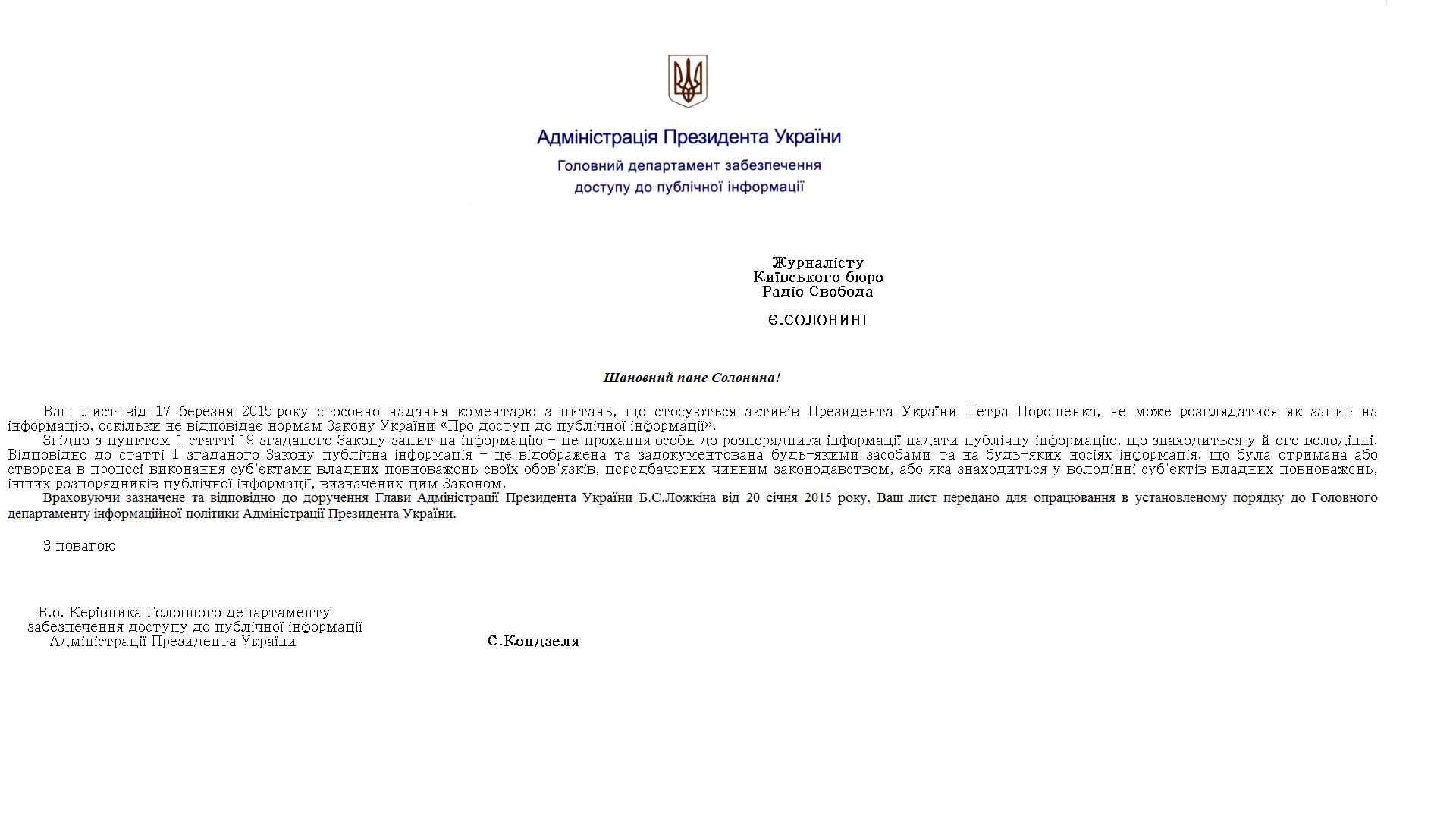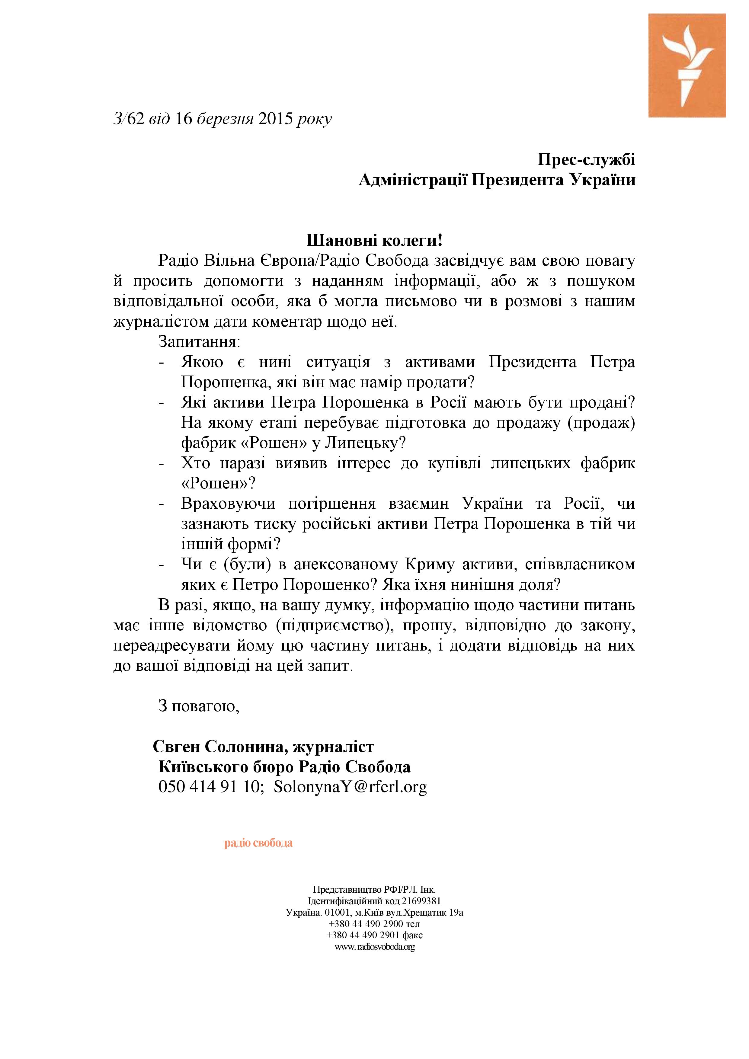 Корреспонденты Украинской службы Радио Свобода обратились в администрацию украинского президента, но там ответили, что, обращение не соответствует закону "О доступе к публичной информации", потому что государство "не обладает и не производит" такой информации.