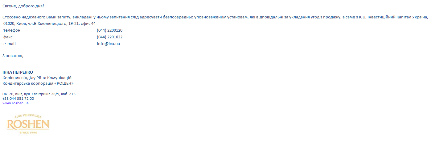 Официальный запрос Радио Свобода направило также кондитерской корпорации "Рошен", которая имеет производство в Украине, в ЕС и фабрики "Рошен" в российском Липецке и в Липецкой области. В корпорации "Рошен" журналистов с запросами переадресовали к компании "Инвестиционный капитал Украина" (ICU Group), которая выступает советником по продаже президентских активов вместе с инвестиционной компанией "Ротшильд групп" (Rothshild group).