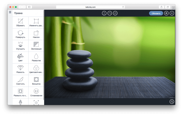 В редакторе BeFunky есть панель с инструментами, которые сгруппированы по своему функционалу. Первая вкладка представляет собой инструменты для основной правки изображения. Здесь можно изменить размер, обрезать картинку, изменить цвет и резкость, поменять экспозицию или повернуть изображение.