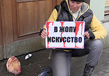 Затем еще один "православный" - в костюме смерти и с косой - сорвал со своих товарищей маски и бросил их на крыльцо театра. Участники акции принялись скандировать: "Россия без богохульства!" После этого Энтео растоптал маски. Наконец, один из его сторонников прикрепил ко входу в театр плакат с надписью "В жопу искусство".
