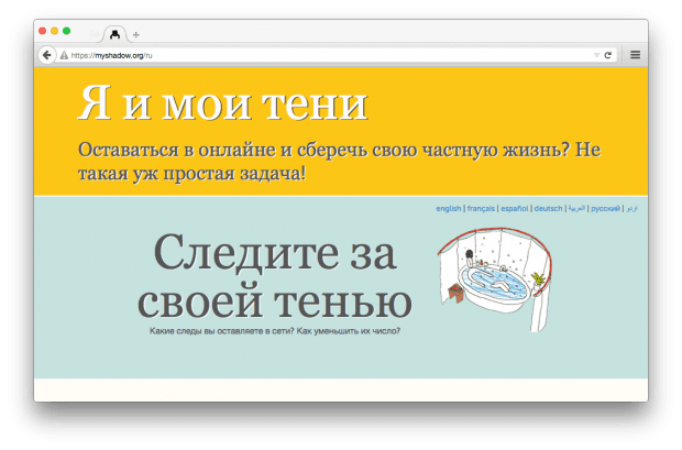Сайт Me & My Shadow (Я и мои тени) теперь доступен на русском языке. Его цель – помочь больше узнать о цифровой «тени», которая тянется за пользователями Интернета. Ресурс предлагает подобрать инструменты, чтобы изменить размеры и форму этой тени, а также узнать, как вы, ваша семья и ваши друзья могут укрепить свою безопасность в цифровом мире.