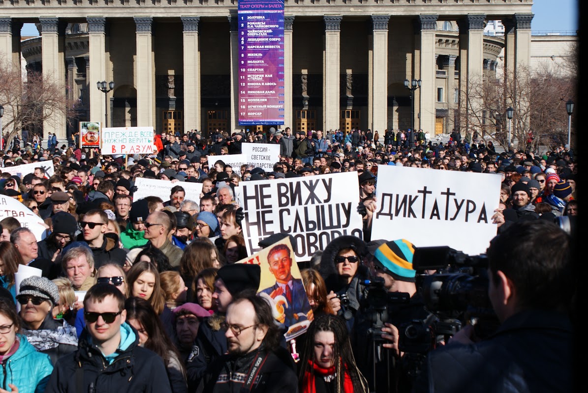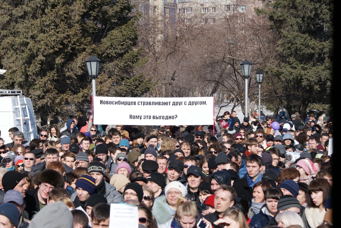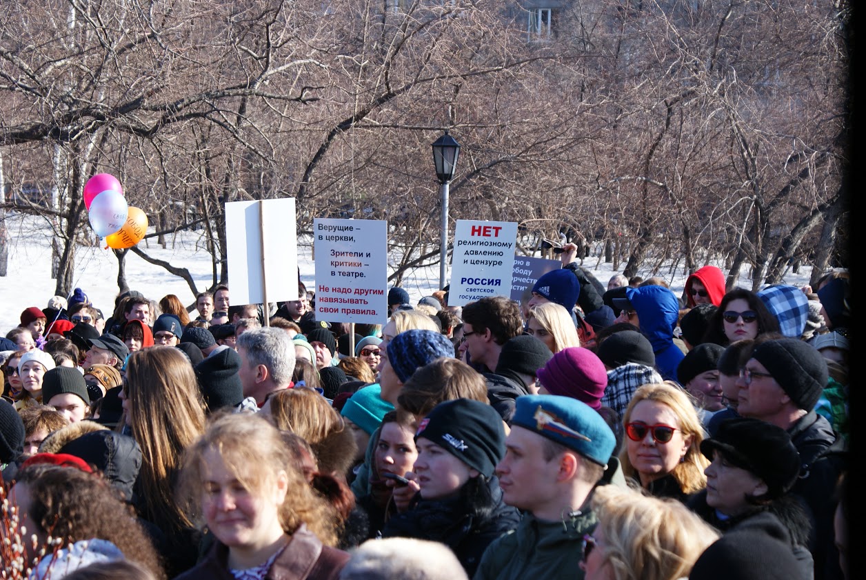 "Заступимся за искусство!" – под таким лозунгом в воскресенье в Новосибирске прошел митинг за свободу творчества. На площади перед театром оперы и балета собрались, по разным оценкам, от трех до пяти тысяч человек. "Христом-богом молю, отстаньте от искусства!", "Кафка нам завидует", "Россия – страна с высокой неоднородностью культуры, при таком разнообразии ценностей опасно требовать от всех "одно суждение иметь" – было написано на плакатах.