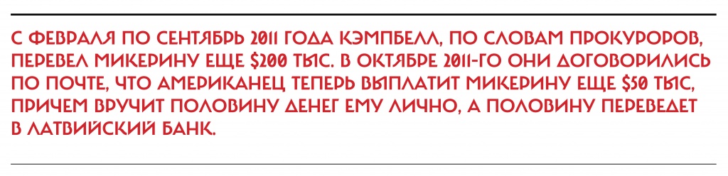 С февраля по сентябрь 2011 года Кэмпбелл, по словам прокуроров, перевел Микерину еще $200 тыс. В октябре 2011-го они договорились по почте, что американец теперь выплатит Микерину еще $50 тыс, причем вручит половину денег ему лично, а половину переведет в латвийский банк.