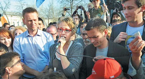 В Астрахани в апреле 2012 года Собчак вывела на улицы тысячи людей: популярность ее тогда намного превосходила популярность Алексея Навального (крайний слева), Ильи Яшина и Дмитрия Гудкова (крайний справа)