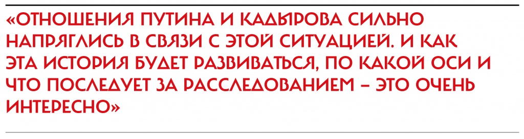 Его еще называют «человек за спиной», поскольку он много лет охранял Путина. И, кстати, полк «Север», в котором служил один из арестованных по делу об убийстве Бориса Немцова, приписан к этим самым внутренним войскам. Золотов с вами пытался связаться? Нет. Но что мне кажется очевидным по многим признакам — отношения Путина и Кадырова сильно напряглись в связи с этой ситуацией. И как эта история будет развиваться, по какой оси и что последует за расследованием — это очень интересно. Я не знаю, станет ли нам известно, кто заказал это убийство, но я абсолютно не сомневаюсь, что это точно узнает Путин. Он точно будет знать, кто за этим стоит. И я знаю: прилагается масса усилий, чтобы расследование дало ответ на этот вопрос. И что за этим последует — это уже будет касаться всех нас. Я всегда считала, что линия «братьев» Путин — Кадыров — это очень рискованная ставка, которая в какой-то момент может обернуться таким кризисом, такой войной — короче, дай бог, чтобы до этого не дошло.