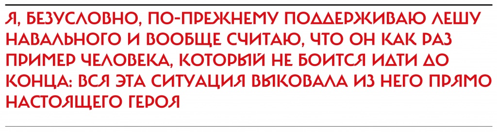 Я, безусловно, по-прежнему поддерживаю Лешу Навального и вообще считаю, что он как раз пример человека, который не боится идти до конца: вся эта ситуация выковала из него прямо настоящего героя. Можно не разделять какие-то его взгляды и идеи, но невозможно не уважать того, как мужественно он себя ведет, как борется и с каким бесстрашием он этой борьбе посвящает свою жизнь. Это вызывает глубочайшее мое уважение.