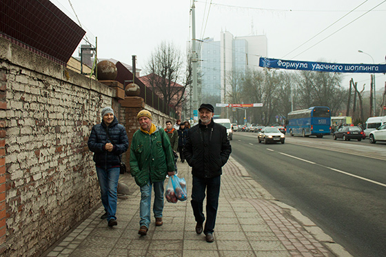 © Наталия Зотова Еженедельное собрание КОС на площади. Слушают гимн Украины КОС собирается на одной из центральных площадей еженедельно. Встают в кружок на площади, Анна Марьясина играет на флейте гимн Украины в знак солидарности с братским народом — последнее, что еще не страшно делать. Раньше согласовывали пикеты и митинговали: в поддержку Болотной, за Pussy Riot, против «дела 6 мая», против войны на Украине… Но 21 сентября местный маленький «Марш мира» обступили крепкие парни с георгиевскими лентами. Антимайдан начал действовать в Калининграде раньше, чем в остальной России: эти люди перекрикивали митинг и кидали в оппозиционеров яйцами, но этим не кончилось. После митинга кто-то подкараулил и поодиночке избил двоих участников митинга: Александра Горбунова и Андрея Богданова. Это была первая ласточка. Через месяц после еженедельного пикета КОС напали на Василия Адрианова и Евгения Гришина: последний в результате почти перестал видеть одним глазом. Еще через несколько дней был избит Дмитрий Иркитов: и так инвалид с тяжелым заболеванием легких, он получил удары в грудь, что кончилось операцией по удалению части легкого. Больше КОС не митингует. Время и место еженедельных собраний на всякий случай все время меняют. Активисты молча слушают украинский гимн, а потом идут на рынок за продуктами для передач. Возле рынка под флагом «Новороссии» другие, враждебные, активисты собирают материальную помощь луганским сепаратистам. Впрочем, уголовное дело считают бредом даже идеологические противники: участник движения «Новороссия» Евгений Лабудин стоял напротив калининградского «Марша мира» с плакатом про «пятую колонну», но даже он как-то раз носил передачу Фонареву: «Пятая колонна нагнетает обстановку, а страдают-то они!»
